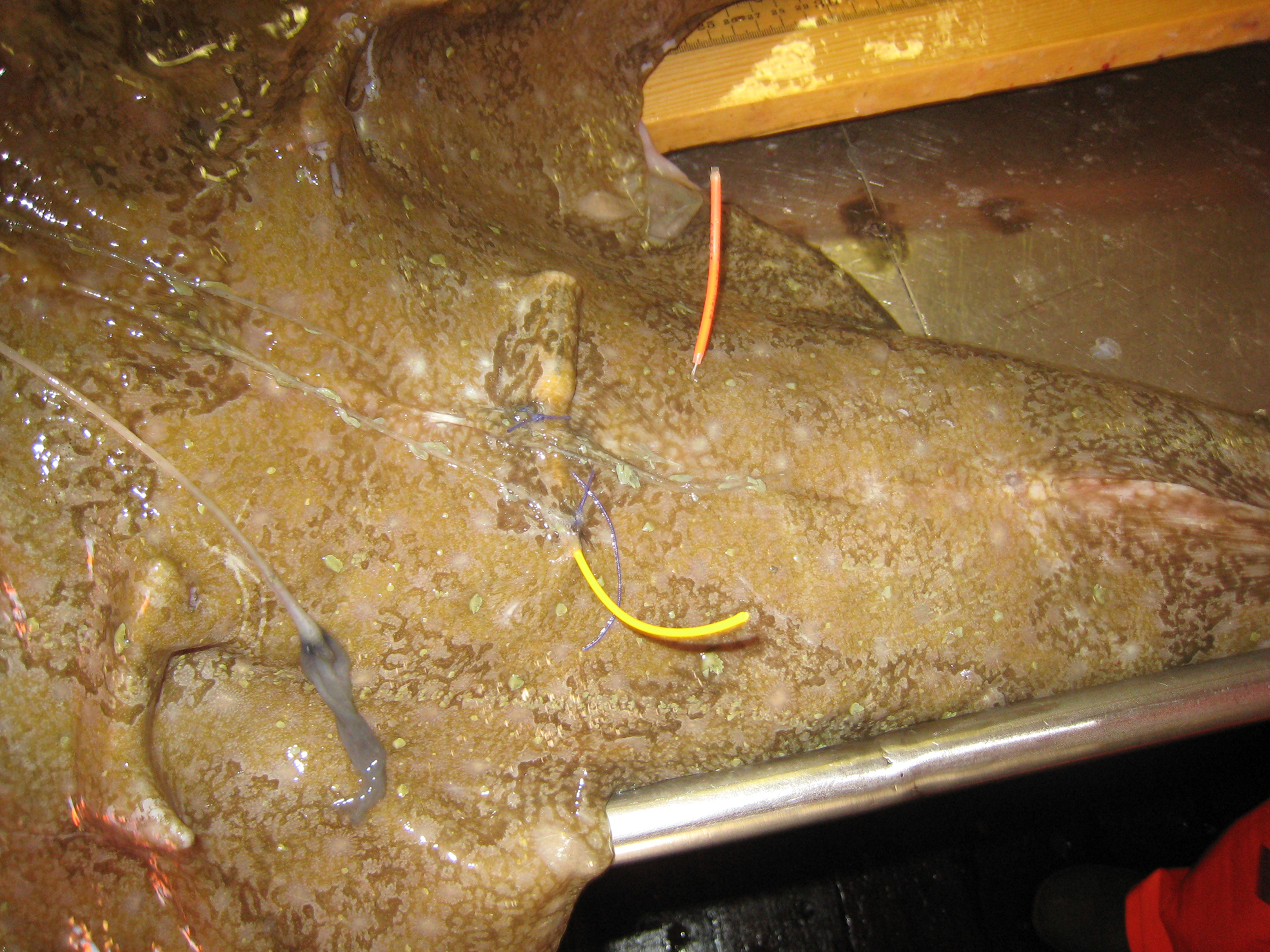 Guli gummitráðurin er fastur í einum goymslumerki, sum er opererað inn í ryggin á havtaskuni, og sæst sum ein sylindari undir skræðuni. Goymslumerkið goymir hita og dýpi, meðan fiskurin svimur.
